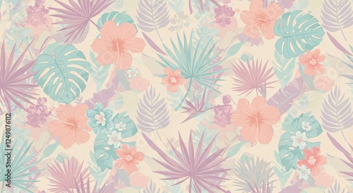 Seamless patterns of tropical leaves and floral designs in pastel tones
