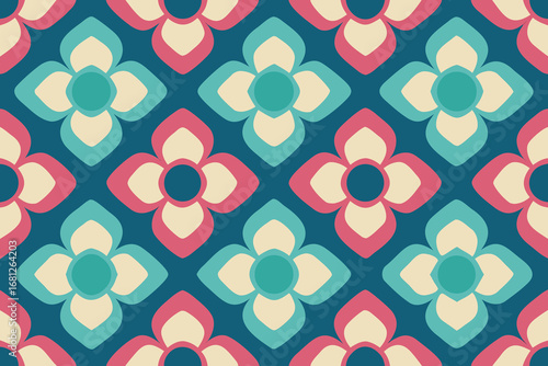 Seamless Retro Floral Pattern Teal, Pink, and Beige Flower Repeating Background Design