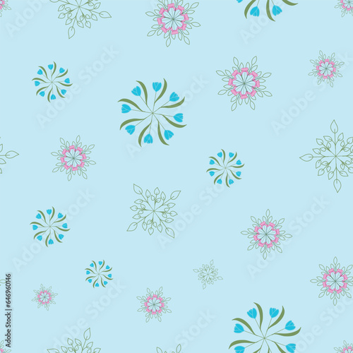Seamless Vector Repeat Pattern with Scattered flower Wheels of Purple Lilies, Pink Peonies, Blue Tulips and Green Line Art Leaves on Blue