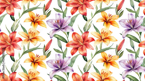 Seamless watercolor floral pattern featuring hand drawn lilies and vibrant flowers on a clean white background