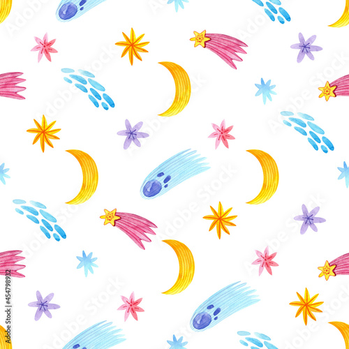 Seamless watercolor pattern with stars, moon, meteors, and comets on white background. Cute baby space print.