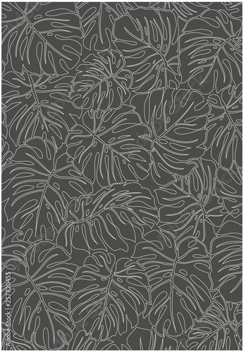 Seamless white lined pattern of tropical leaves pattern style, flat line vector and illustration on dark grey background.