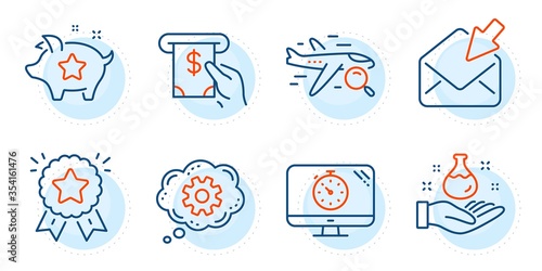 Search flight, Loyalty points and Ranking star signs. Atm service, Seo timer and Open mail line icons set. Cogwheel, Chemistry lab symbols. Cash investment, Analytics. Technology set. Vector