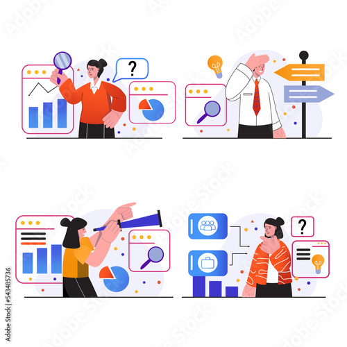 Searching opportunities concept scenes set. People looking for vacancies in company, finding job, HR management, recruiting, human resources. Illustration collection in trendy flat design