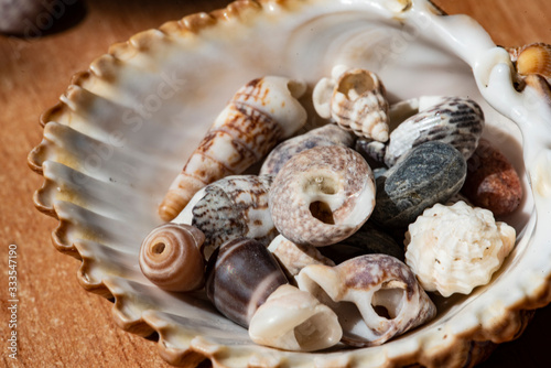 seashells a cheerful and summery ensemble from the bottom of the sea on a diffuse and colorful background that evokes the tranquility and serenity of the environment from which they come
