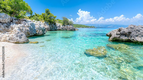 Secluded cove, turquoise water, rocky beach, sunny day, travel postcard