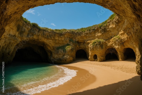 Secluded seaside cove featuring grottos, sandy shores, and rugged cliffs