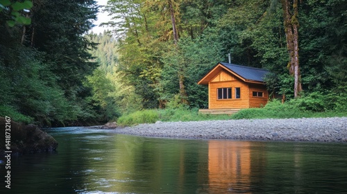 Secluded wooden cabin nestled beside tranquil river in lush green forest