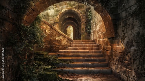 Secret underground passage leading to the heart of a medieval castle. Gloomy place, ghosts, dust, secret tunnel, paranormal, gothic, middle ages, ruins, dampness, mysticism, fear. Generative by AI