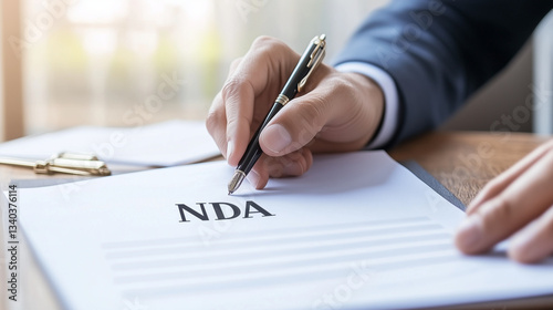 Securing Confidentiality: A close-up captures a hand signing a Non-Disclosure Agreement (NDA), symbolizing the importance of secrecy in business contracts