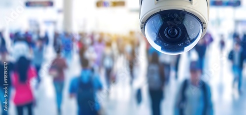 Security camera overlooking a busy public space, with blurred people in the background. The camera is positioned high above the crowd, emphasizing its surveillance role.