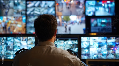 Security officer focused on multiple digital screens showing live CCTV footage, modern control room environment