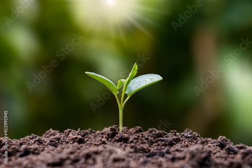 Seedlings grow from fertile soil and the morning sun shines, concept of plant growth and ecological balance.