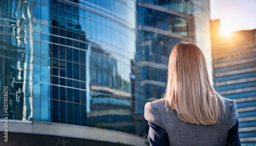 seen from behind business woman near office building