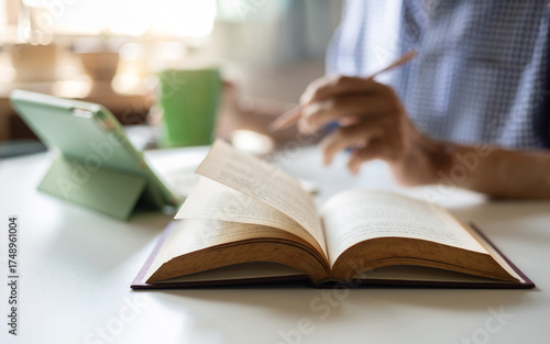 select focus on open book and blurred person in background using digital tablet to seek knowledge via internet online