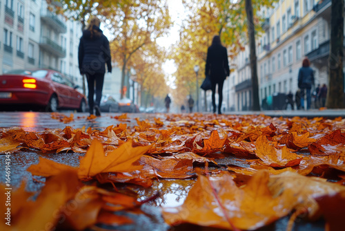 Selective Focus on Fallen Leaves During Busy Autumn Walk