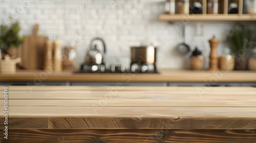 Selective focus on wooden kitchen island empty dining table with copy space for display products clean countertop for cooking healthy food against blurred furniture with grey facade in : Generative AI