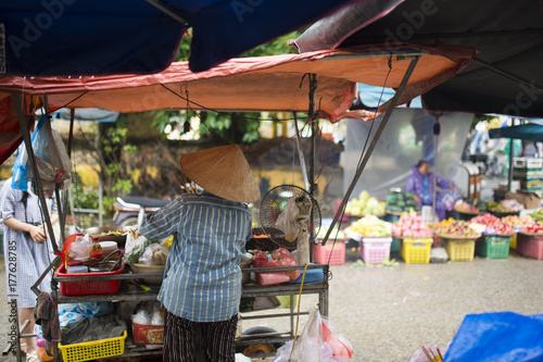 -Selective focus- Unidentified woman with typical vietnamese conical hats sell fresh vegetables and meat skewers on a street market in Hoi An, Vietnam