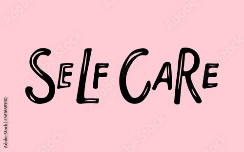 Self care text isolated black on pink background. Motivational Quote. Cheering phrase. Handwritten design for banner, flyer, brochure, card, poster. Positive quote about taking care of yourself