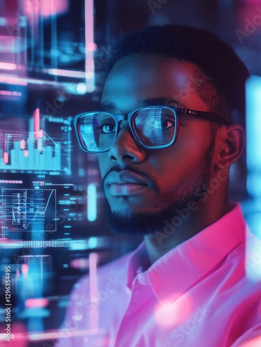 Self-confident black scientist in glasses and pink shirt using futuristic touchscreen display, drawing charts and diagrams, looking at the camera. People and future technology concept. Double exposur