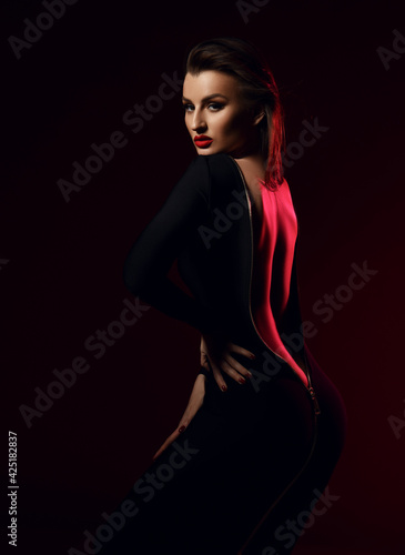 Self-confident excited sexy woman vamp stands sideways in black tight unzipped dress ready to take it off demonstrating naked back in darkness. Fashion, vogue, sexy stylish look for woman concept
