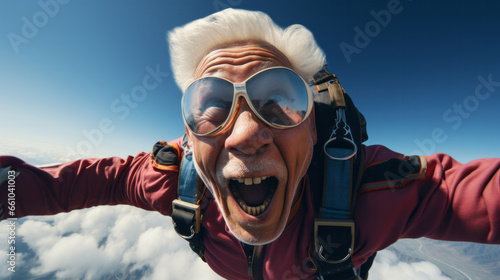 Selfie of a skydiving senior man. Extreme sport fun retirement adventure