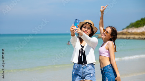 Selfie on the beach. Two friens teenager girl woman holding smart phone in hand shooting selfie photo on tropical beach. Vacation trip summer holiday.