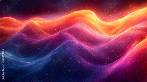 Semiabstract representation of gravitational waves with vibrant rippling neon patterns flowing through space symbolizing cosmic forces and physics