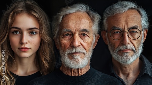 Senior and youth generations showcasing age, comparing faces before and after for aging and human development.