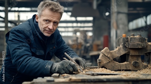 Senior artisan in a cinematic portrait, working on a wooden sculpture amidst a rustic workshop's tools and shavings.