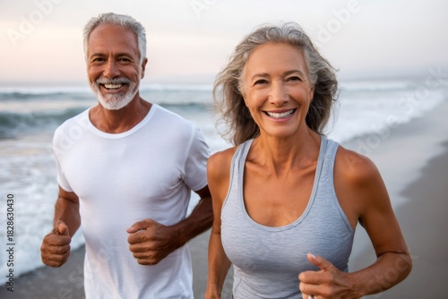 Senior couple jogging happy on beach enjoying healthy lifestyle