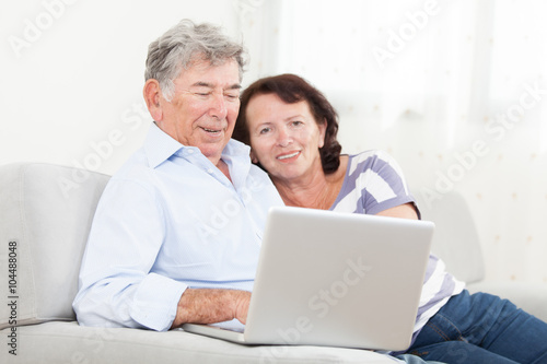 Senior couple laughing while using laptop
