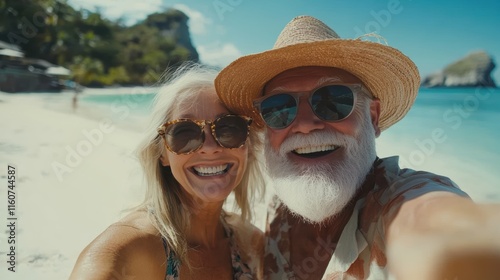 senior couple tourist. Enjoy free time outdoors near the sea on the beach. Looking at the camera while relaxing on a clear day Poses for travel selfies smiling happy tropical.