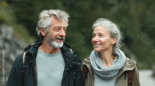 Senior couple walking outdoors in scenic park, smiling and enjoying nature together, wearing casual jackets and sweaters, autumn forest background, healthy lifestyle