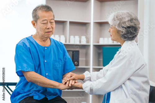 Senior elderly male patient and asian people mature woman doctor, showcasing importance of healthcare expertise and patient support. caring senior doctor assisting elderly patient in hospital bed