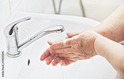 Senior elderly woman wash hands under tap water faucet. Can be used as hygiene illustration concept during coronavirus / covid-19 outbreak prevention