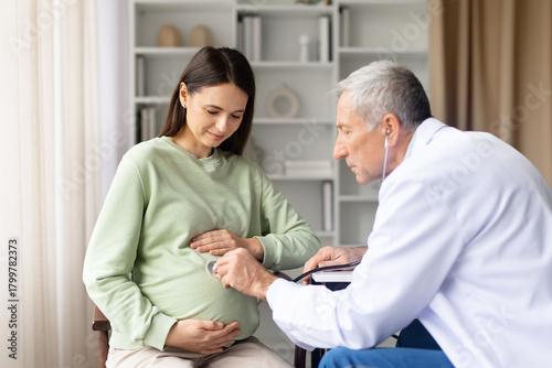 Senior male doctor using stethoscope to examine pregnant womans belly during prenatal checkup in clinic, maternity healthcare and pregnancy care concept
