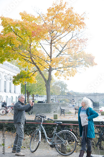 Senior man photographing wife with bicycle in autumn city