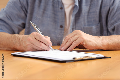 Senior man signing Last Will and Testament at wooden table, closeup