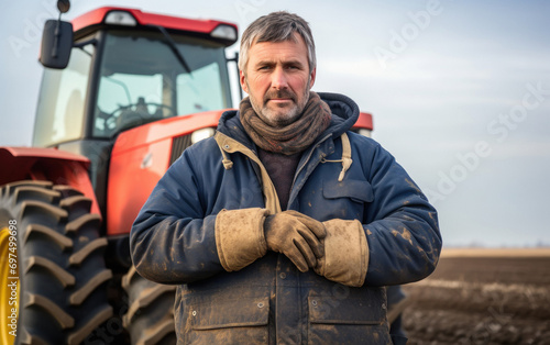 senior western farmer standing at farm with tractor