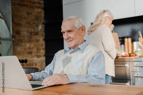 senior wife cooking while happy husband using laptop on kitchen during self isolation