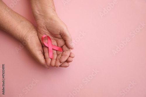Senior woman holding pink ribbon on color background, top view with space for text. Breast cancer awareness