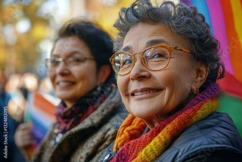 Senior woman wearing rainbow scarf smiles while attending a pride parade with her friend