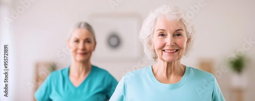Senior woman with her caregiver during a fitness session, promoting active aging, light-filled space