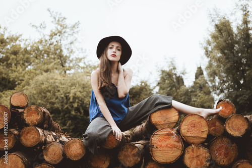 Sensual stylish woman on log pile