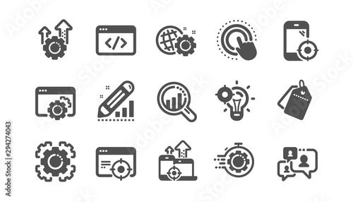 Seo icons. Website stats, Target and Increase sales signs. Traffic management, social network and seo optimization icons. Classic set. Quality set. Vector