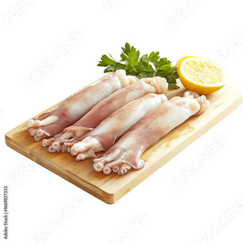 seppioline crude su tagliere Isolated transparent on white background