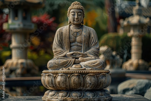 Serene Amaravati Buddha Teachings: Tranquil Statue on Lotus Throne with Ornate Robes in Peaceful Landscape