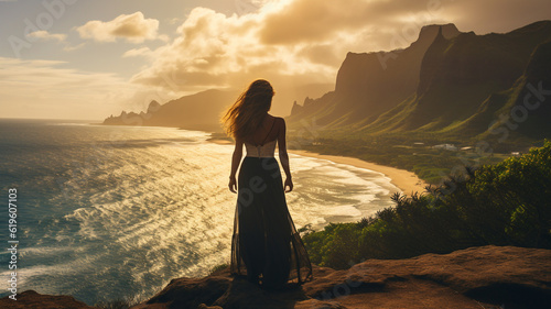Serene Beach Landscape at Sunset: Silhouetted Woman in Tropical Paradise Photograph