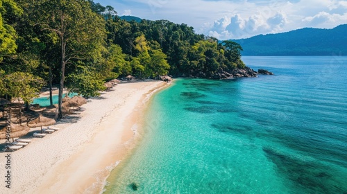 Serene beach with vibrant turquoise waters, ideal for showcasing tropical destinations and luxury travel